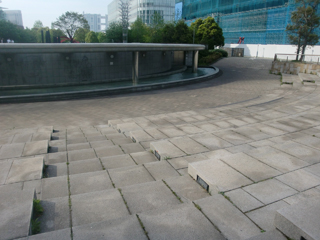 脇の階段を降りて行くと、滝の前に広がる半円状の石の階段。